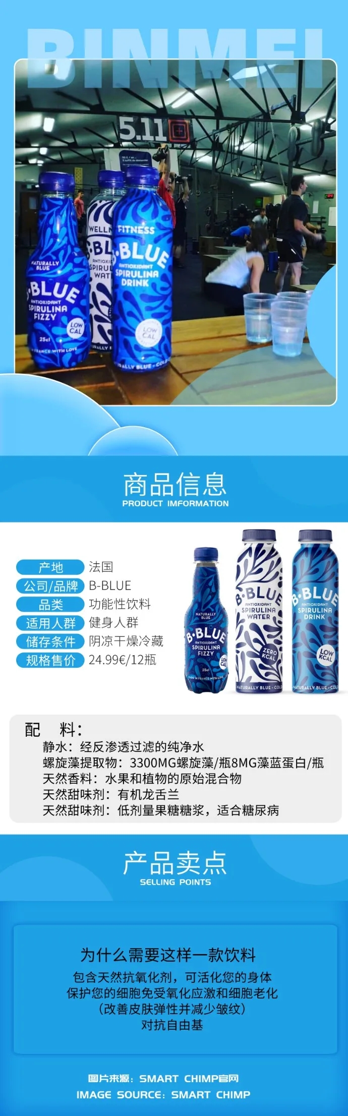 而B-BLUE并不是**家嘗試將藻藍蛋白加入到運動飲料中并獲得成功的,SMART-CHIMP也是一家將藻藍蛋白加入到運動飲料中的公司。并通過混合不同的天然原料(例如:百香果、接骨木果、黑加侖等),賦予了藻藍蛋白新的生命力。而藻藍蛋白,則使SMART-CHIMP的飲料呈現(xiàn)華麗的藍色。